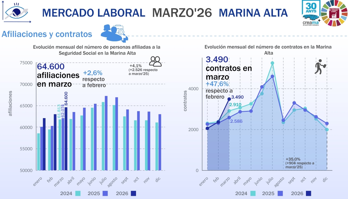 DÉNIA.- La Marina Alta ha cerrado marzo con una fotografía laboral que confirma un cambio de ciclo: más empleo, más contratación y menos paro, en un contexto marcado por la estacionalidad de la Semana Santa pero también por una tendencia de fondo que se mantiene estable desde hace más de un año. Los datos analizados por el Observatori Marina Alta de CREAMA muestran un mercado laboral que no solo crece, sino que lo hace con una solidez que no se veía desde antes de la crisis financiera de 2008.