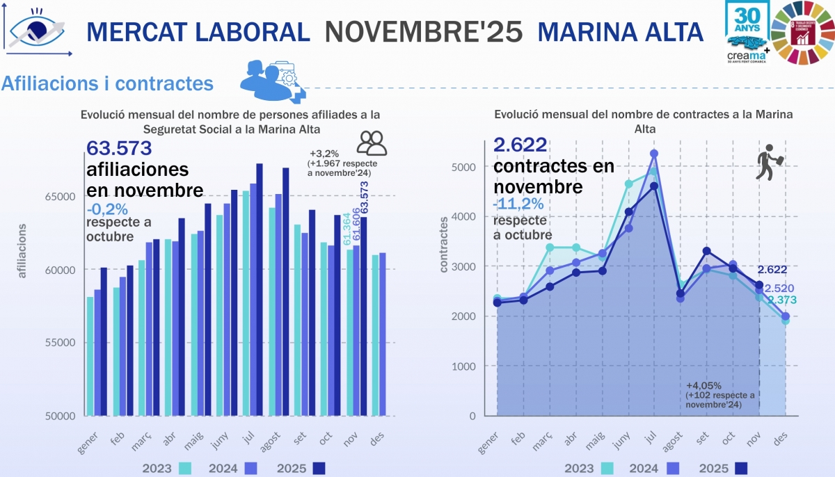 En conjunto, noviembre confirma un ajuste estacional contenido. La afiliación se mantiene en máximos históricos, el paro apenas se mueve y la contratación consolida un mercado laboral más estable. La Marina Alta cierra el mes con una tasa de desempleo estimada del 10,69%, inferior a la provincial y autonómica, lo que reafirma la solidez del mercado de trabajo comarcal.