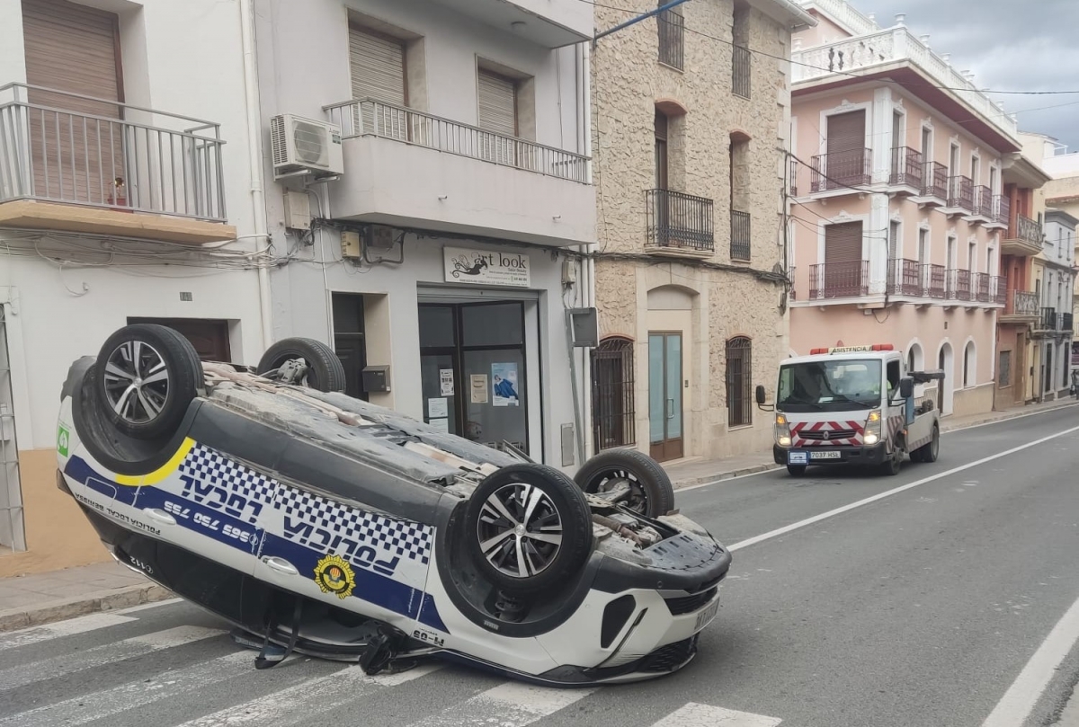 BENISSA. Un vehículo de la Policía Local de Benissa ha volcado este miércoles en el centro urbano de Benissa tras colisionar con un turismo particular. El accidente se ha producido entre las 13.00 y las 14.00 horas en la avenida del País Valencià, en el cruce con la calle Capitán Cabrera.