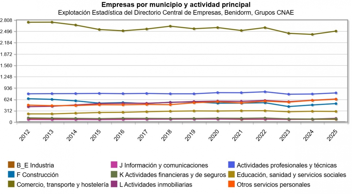 BENIDORM. Benidorm encandena el tercer año consecutivo creciendo en número de empresas. Así lo recoge el último informe del Instituto Nacional de Estadísticas (INE) que hace referencia a una foto fija: la del 1 de enero de 2025. De ella se extrae la recuperación de los sectores más importantes para el municipio después de la pandemia, como es el sector servicios o las agencias inmobiliarias y la construcción.