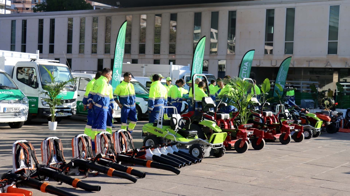 BENIDORM. Nuevo contrato, aunque misma empresa. El Ayuntamiento de Benidorm ha mostrado este jueves el nuevo servicio de conservación, mantenimiento y limpieza de zonas verdes que estará gestionado por los próximos cinco años por Actúa, concesionaria del contrato anterior. Una gestión para la que han anunciado un incremento de la superficie verde del municipio con más flores y la renovación de maquinaria con vehículos ECO.