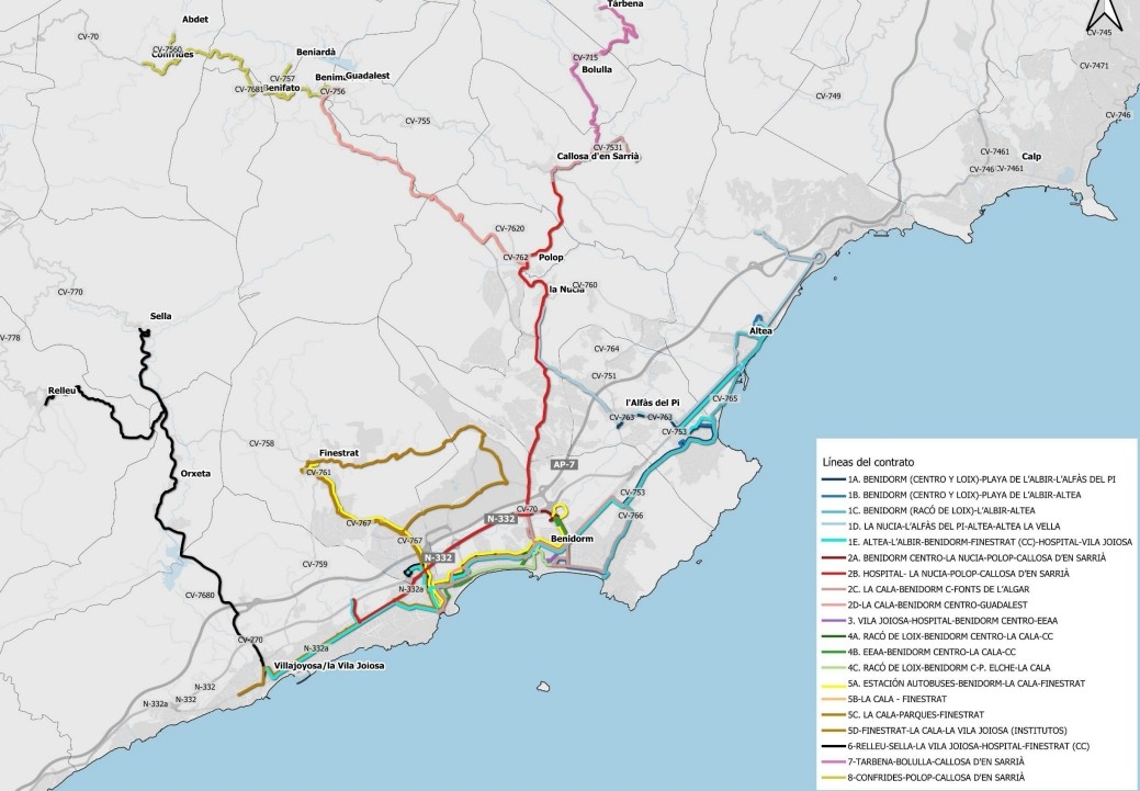 Para ello han diseñado 20 líneas donde existen ocho principales. La Línea 1 'Benidorm-l'Alfàs del Pi-Altea' con cinco líneas adscritas; la Línea 2 'Benidorm-La Nucía-Polop-Callosa d'en Sarrià' con cuatro líneas; la Línea 3 'La Vila Joiosa-Hospital-Benidorm Centro- EEAA', la Línea 4 'Benidorm-La Cala' con tres líneas; la Línea 5 'Benidorm-Finestrat-La Vila Joiosa' con cuatro líneas; la Línea 6 'Relleu-Sella-La Vila Joiosa-Hospital-Finestrat (CC)'; La Línea 7 'Tàrbena, Bolulla, Callosa d'en Sarrià' y la Línea 8 'Confrides-Polop-Callosa d'en Sarrià'.