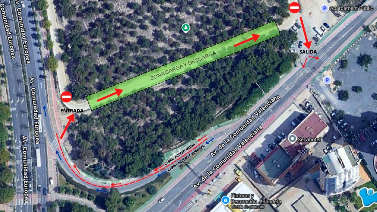 Ayuntamiento y Associació de Penyes han establecido que el recinto abrirá sus puertas a las 8.30 horas del domingo para que los peñistas más madrugadores puedan elegir su parcela y descargar lo necesario para pasar allí el día. Los vehículos deberán acceder por el vial de la avenida de la Comunidad Europea, donde se habilitará una zona de carga y descarga junto al parque, y una vez que hayan descargado realizarán la salida por la avenida de la Comunitat Valenciana.