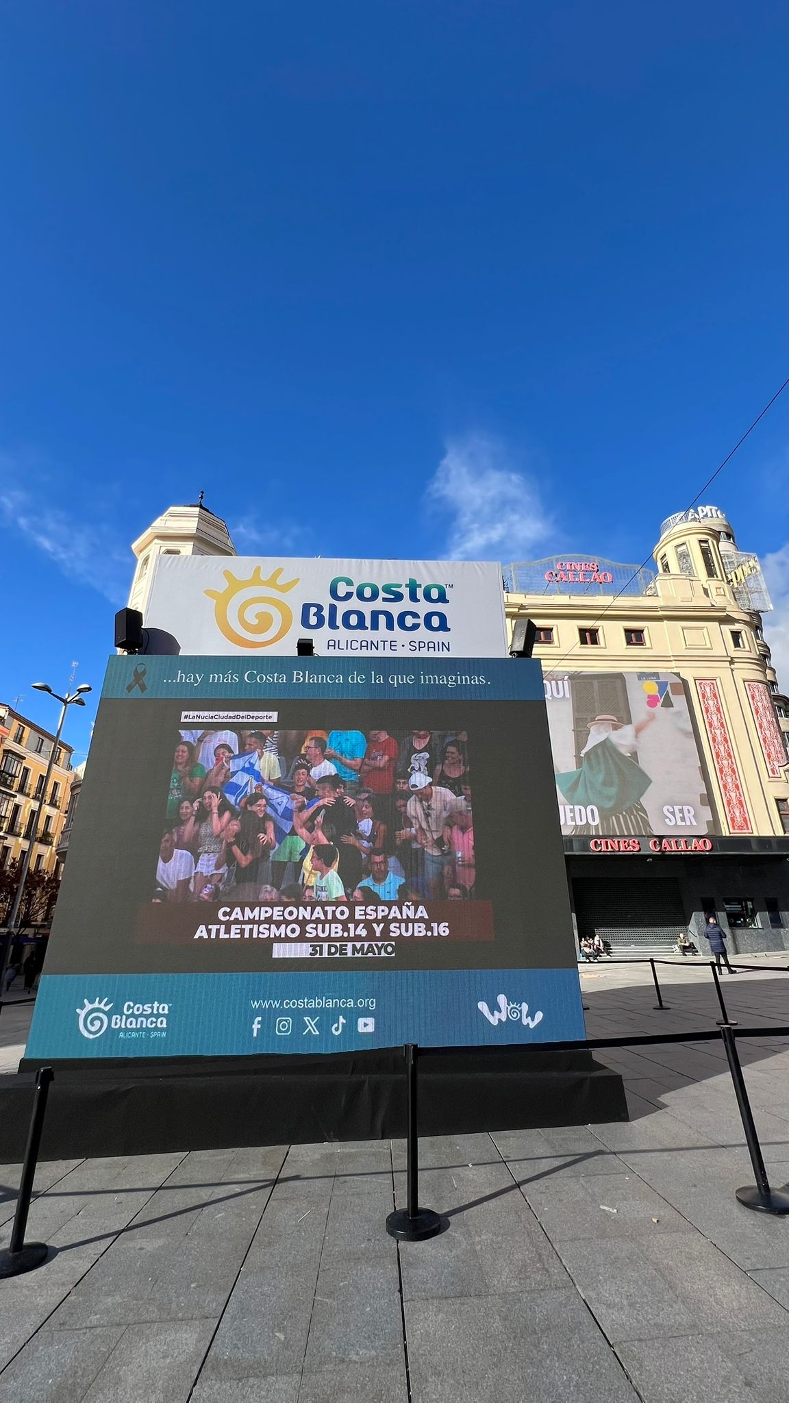 En este “Cubo Digital Costa Blanca” de proyección continua se puede visionar el video de promoción de “Eventos Deportivos 2026” de La Nucía, a través de sus cuatro grandes pantallas de leds. Además, este año se ha instalado de un código QR gigante en la parte superior del cubo para que desde las azoteas y edificios colindantes el público pueda consultar en directo las múltiples propuestas que albergará este espacio 2.0. Una promoción que llamará la atención de las miles de personas que paseen por el centro de Madrid, dada su estratégica ubicación en la plaza Callao, junto a la Gran Vía.