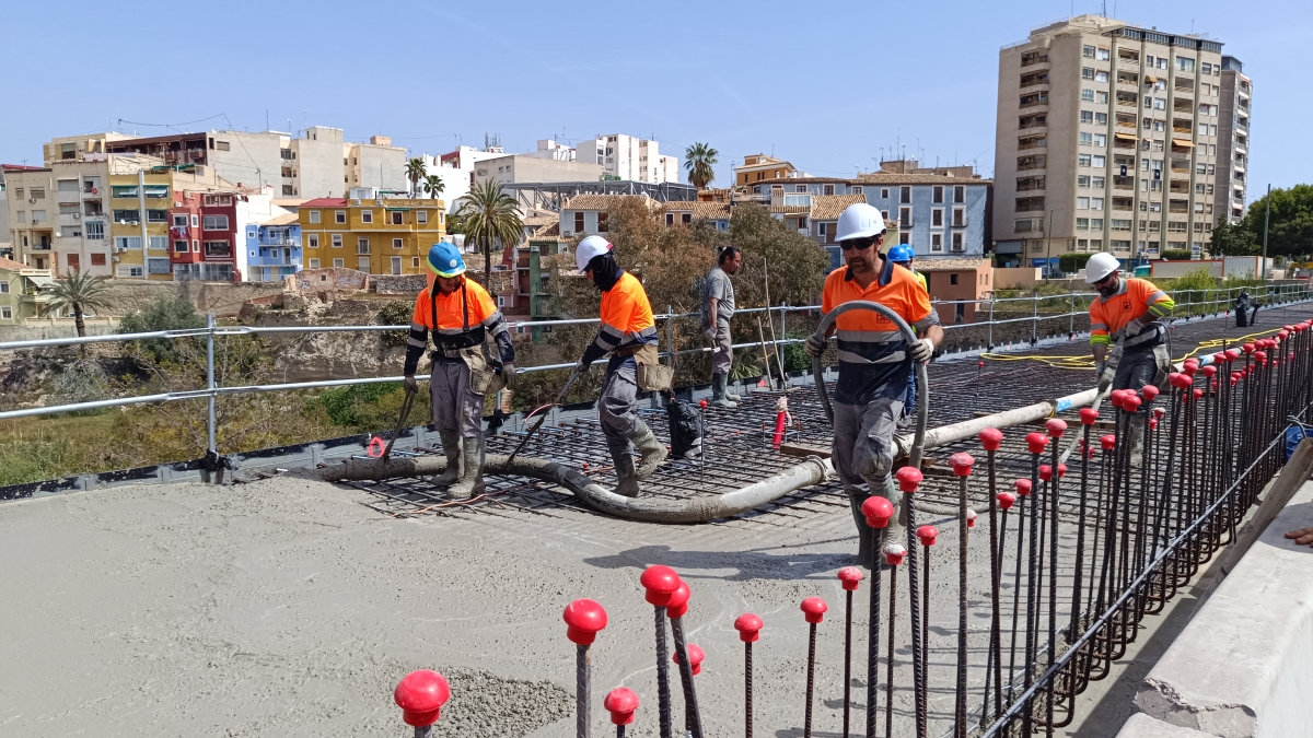 LA VILA JOIOSA. Las obras de ampliación del tablero del Puente del río Amadorio (calle Cervantes) de la Vila Joiosa continúan en marcha con el hormigonado de la losa que permitirá ampliar la anchura de este puente.