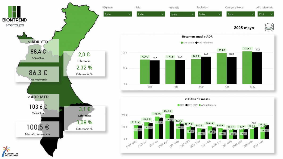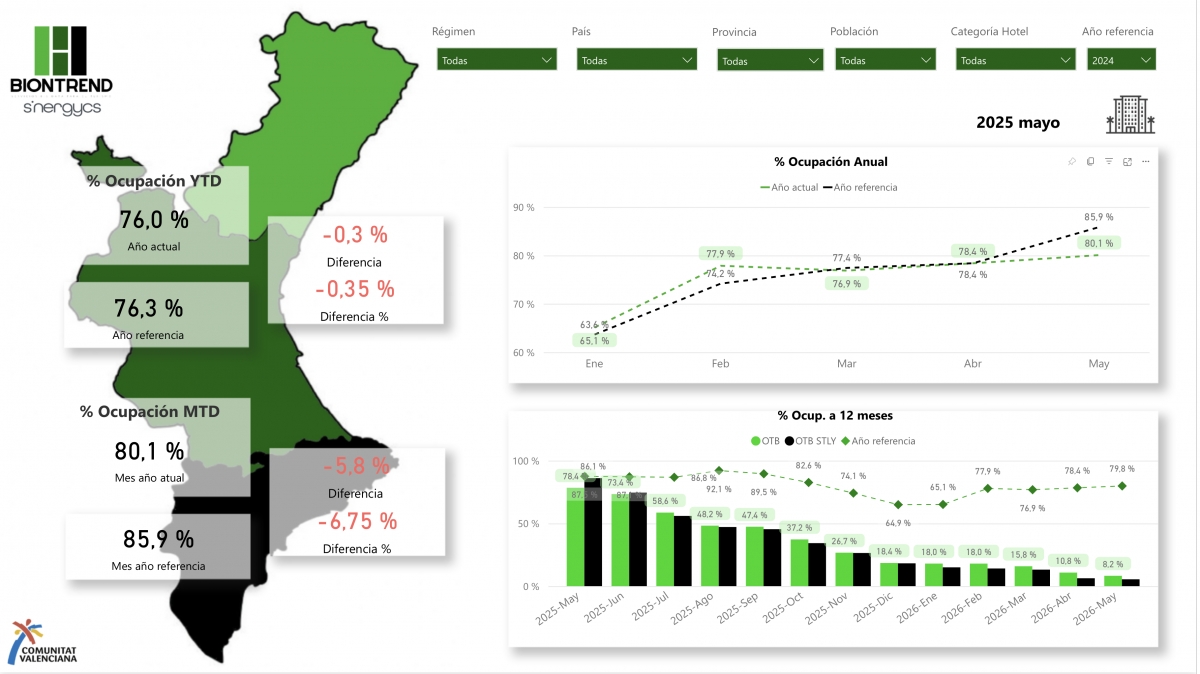 En estos momentos la Comunitat Valenciana cae muy ligeramente, no llega a medio punto, en ocupación media respecto del año 2024, pero sus principales indicadores económicos están en positivo: las tarifas medias están en positivo un 2,3% y se esperan picos de producción de más de 200€ durante el mes de agosto.