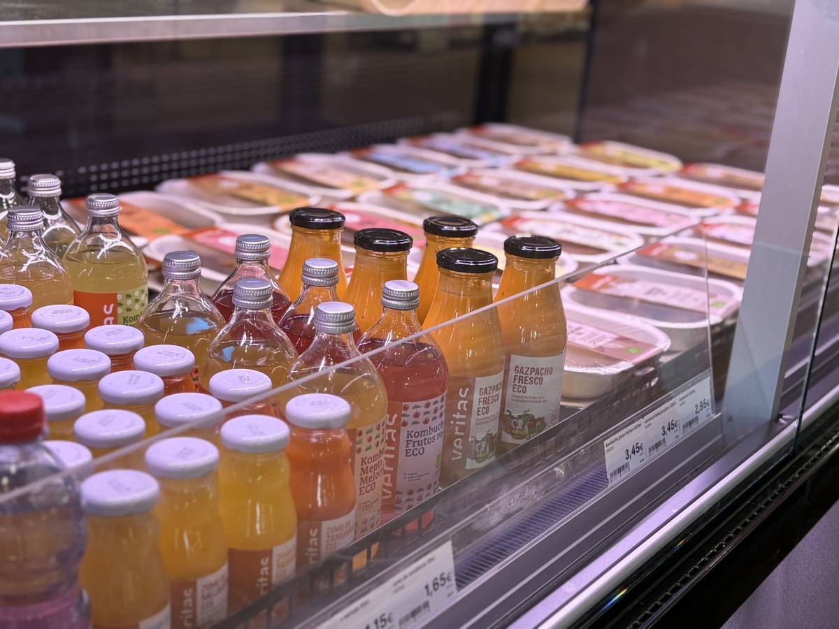 Pasada la sección de platos de la cocina, nos adentramos en un abanico de secciones ampliamente representadas por la marca Veritas y por marcas de conocidos proveedores ecológicos: lácteos, bebidas vegetales, vinos, pastas, conservas, kombuchas, salsas, desayunos... En fin, todo lo que necesitas para hacer una compra bien completa.