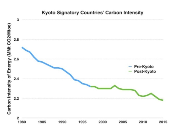 La mayoría de la izquierda climática opina que la amenaza del cambio climático es necesaria para acelerar y justificar una transición más rápida hacia tecnologías energéticas más limpias. Pero sin embargo, en la práctica, no hay evidencia ni pruebas de que en más de 35 años de retórica y afirmaciones cada vez más pesimistas sobre el cambio climático estas hayan tenido algún impacto en el ritmo de descarbonación del sistema energético global. De hecho el mundo se descarbonizó más rápido durante los 35 años previos a que el cambio climático se convirtiera en una preocupación global que en los 35 años posteriores, como se puede ver en la gráfica.