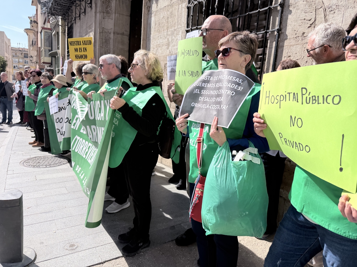 La reivindicación se ha escenificado en una concentración celebrada frente al Ayuntamiento, donde representantes de la plataforma registraron un escrito dirigido al alcalde en el que denuncian la “infradotación” de recursos sanitarios en la costa oriolana pese al crecimiento demográfico de la zona.