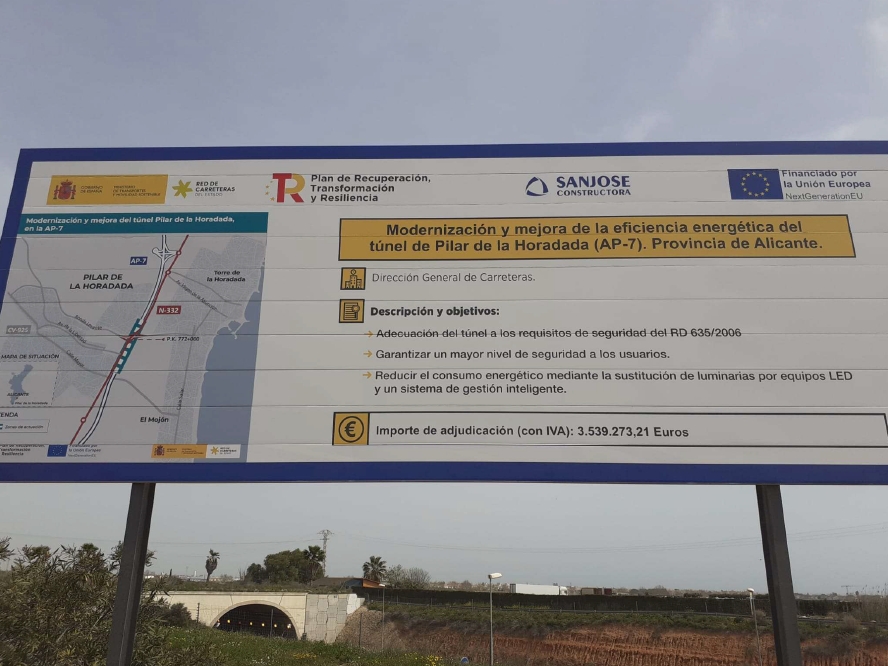 PILAR DE LA HORADADA. El Ministerio de Transportes y Movilidad Sostenible continúa con la ejecución de las obras de mejora de eficiencia energética mediante la gestión inteligente del alumbrado del túnel de Pilar de la Horadada, ubicado entre los km 774 y 770 de la autopista AP-7, en el tramo Crevillente-Cartagena, en la provincia de Alicante.