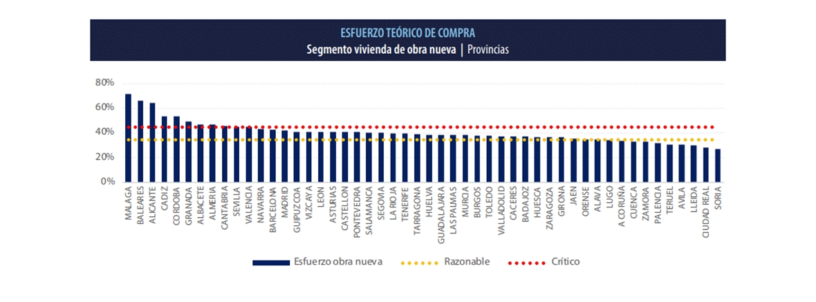 Alicante provincia tampoco escapa a esta dinámica. El esfuerzo teórico para adquirir vivienda nueva supera el 50 % de la renta disponible, lo que la coloca entre las provincias más tensionadas de España. El informe subraya que “el aumento continuado de la demanda ha seguido encontrando un contexto de déficit de oferta”, lo que ha derivado en una mayor presión sobre la vivienda usada y en un encarecimiento generalizado.