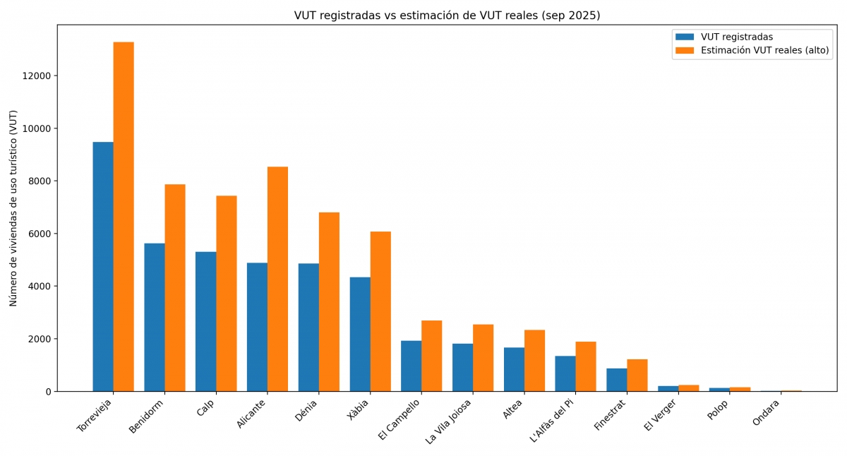 La tabla incluye, entre otros municipios, Benidorm, con 5.625 VUT registradas y 7.875 estimadas, Dénia, con 4.863 viviendas de uso turístico y 6.808,2 estimadas, Xàbia con 4.340 VUT y 6.076 estimadas y Calp, con 5.312 viviendas turísticas y 7.436,8 en estimación, según el informe.