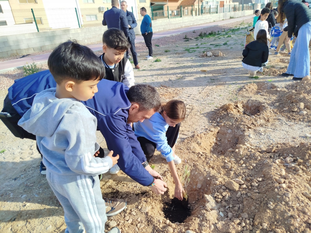 La totalidad del alumnado de Educación Primaria del CEIP Jesús Sánchez, cerca de 180 escolares —desde 1º hasta 6º curso—, ha participado en esta iniciativa, que ha permitido plantar ejemplares de Pinus halepensis, Pinus pinea, Lavandula dentata, Pistacia lentiscus y Rosmarinus officinalis, todas ellas especies autóctonas adaptadas al clima de la zona y de bajo requerimiento hídrico.