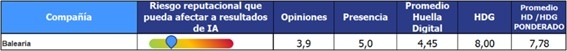 Por su parte, Baleária se caracteriza por un enfoque equilibrado y fiable dentro del ecosistema digital. Destaca por una presencia sólida (5,0) que garantiza visibilidad constante y estabilidad en canales clave. Sus opiniones (4,1) reflejan una percepción positiva y consistente. La huella digital (4,54) acompaña con un buen nivel de desarrollo. En conjunto, se configura como una marca con una base reputacional firme y bien consolidada para seguir evolucionando en entornos digitales y de IA.