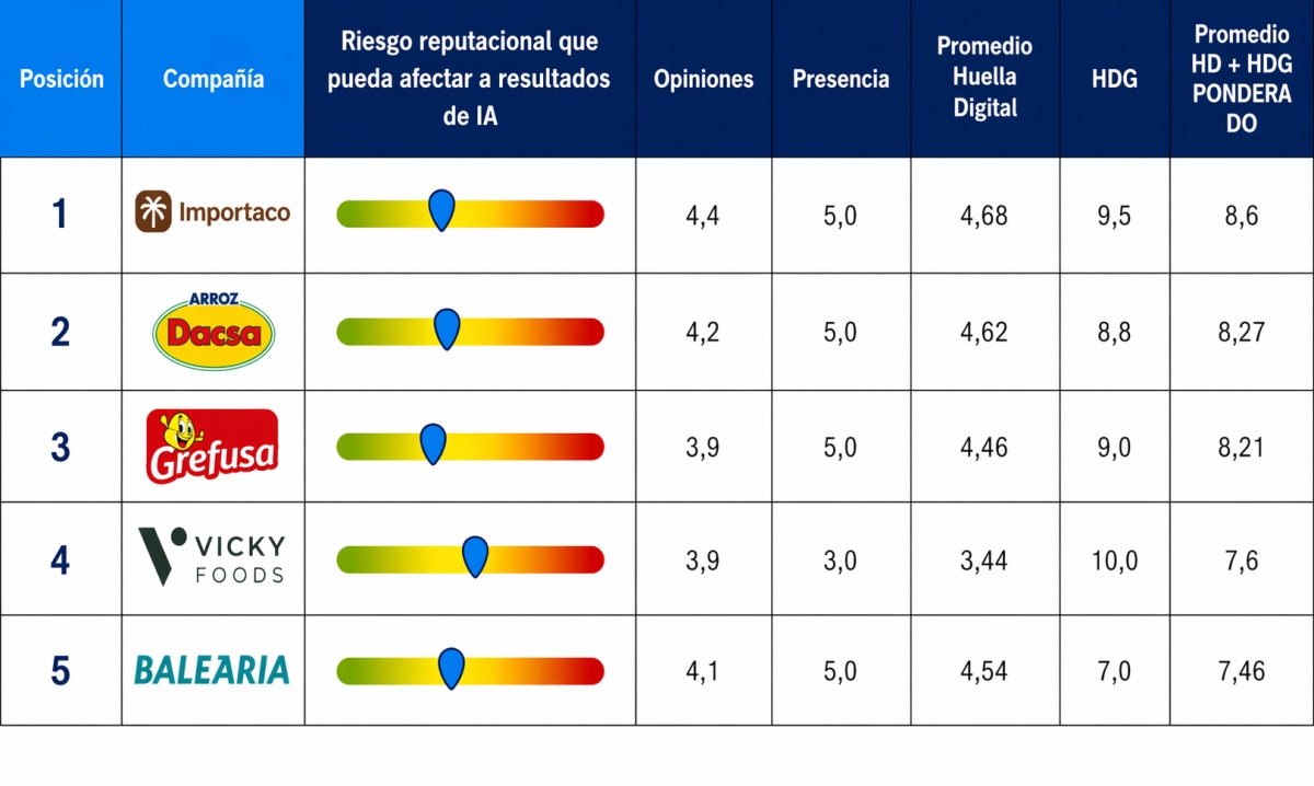 En segundo lugar, destaca Arroz Dacsa sobresale por su consistencia y equilibrio estratégico en todas las métricas analizadas. Mantiene valores muy homogéneos en opiniones (4,2), presencia (5,0) y huella digital (4,62), lo que indica una ejecución coherente y sin grandes debilidades. Su HDG (8,8 sobre 10) refuerza una buena adaptación a entornos generativos. Esta estabilidad le permite construir una narrativa digital fiable y sostenida. En conjunto, se percibe como una marca bien alineada y con una base estratégica clara.