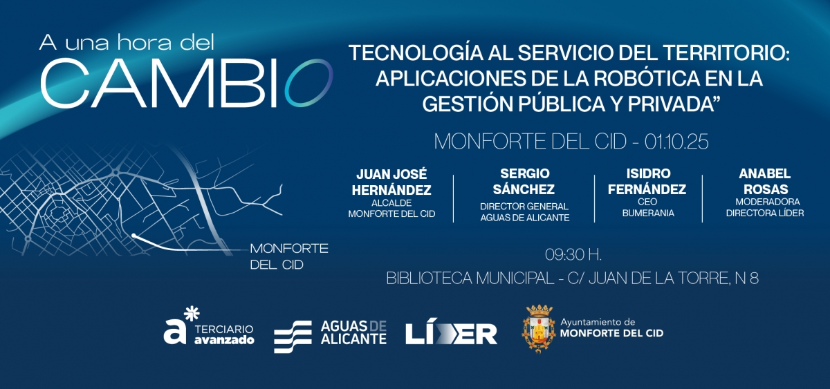 Esta quinta jornada tendrá lugar el próximo miércoles, día 1 de octubre, a partir de las 09:30 h., en la Biblioteca Municipal de Monforte del Cid, ubicada en la calle Juan de la Torre número 8, bajo el título, ‘Tecnología al servicio del territorio: aplicaciones de la robótica en la gestión pública y privada'. Participarán en esta segunda cita: Juan José Hernández, alcalde de Monforte del Cid, Sergio Sánchez, director general de Aguas de Alicante e Isidro Fernández, CEO de Bumerania, actuando como moderadora Anabel Rosas, directora de Líder.