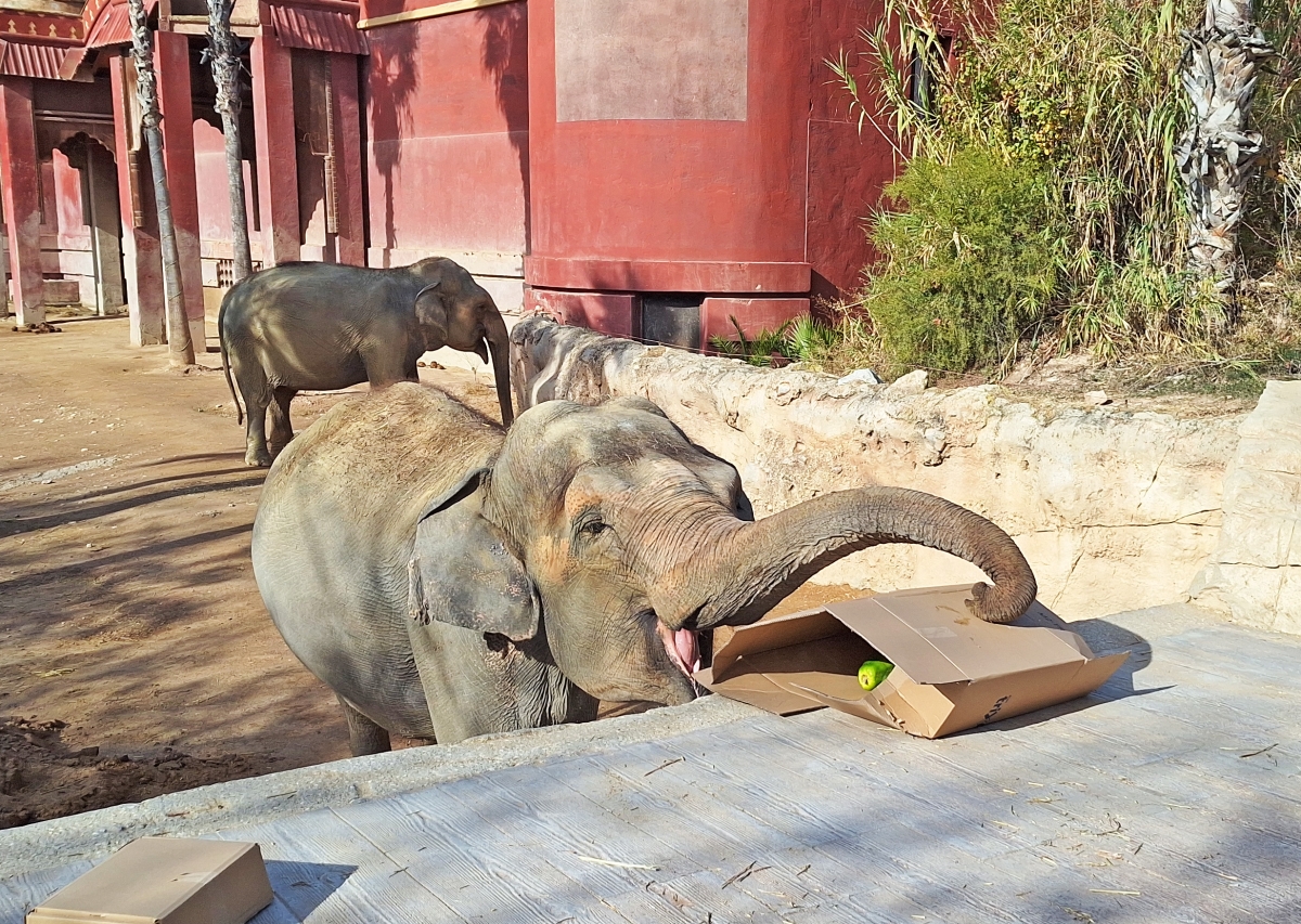 Durante estos días, las distintas especies participan en dinámicas que fomentan el juego, la exploración y el comportamiento natural. En el caso de las nutrias, los cuidadores han preparado cajas rellenas de pescado que se incorporan a la instalación para que desarrollen su ingenio a la hora de localizar y obtener el alimento. Otras especies, como el margay, los saimiris o los elefantes, recorren sus praderas en busca de regalos que esconden comida en su interior, promoviendo así la curiosidad y la actividad física.