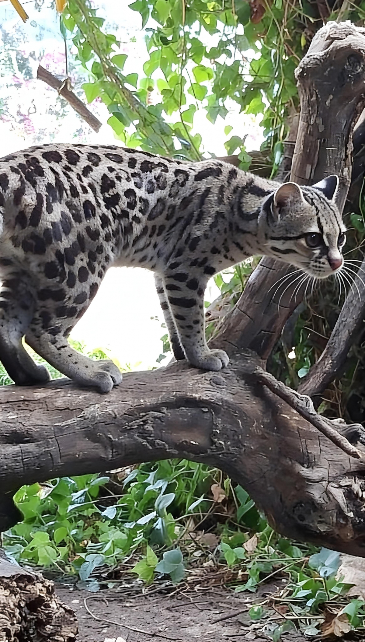 El margay es uno de los felinos más singulares del continente americano. Su distribución natural se extiende desde México hasta Argentina y Uruguay, siempre vinculada a masas de bosque denso y selva. De hábitos nocturnos y carácter solitario, pasa la mayor parte de su vida en los árboles, donde caza, descansa y se reproduce. Destaca por su extraordinaria capacidad arborícola: puede rotar 180º los tarsos de sus patas traseras, descender cabeza abajo e incluso colgarse de una sola pata mientras acecha a sus presas. En estado silvestre se enfrenta a amenazas como la deforestación, la fragmentación del hábitat, el tráfico ilegal, los atropellos y la transmisión de enfermedades por contacto con animales domésticos.