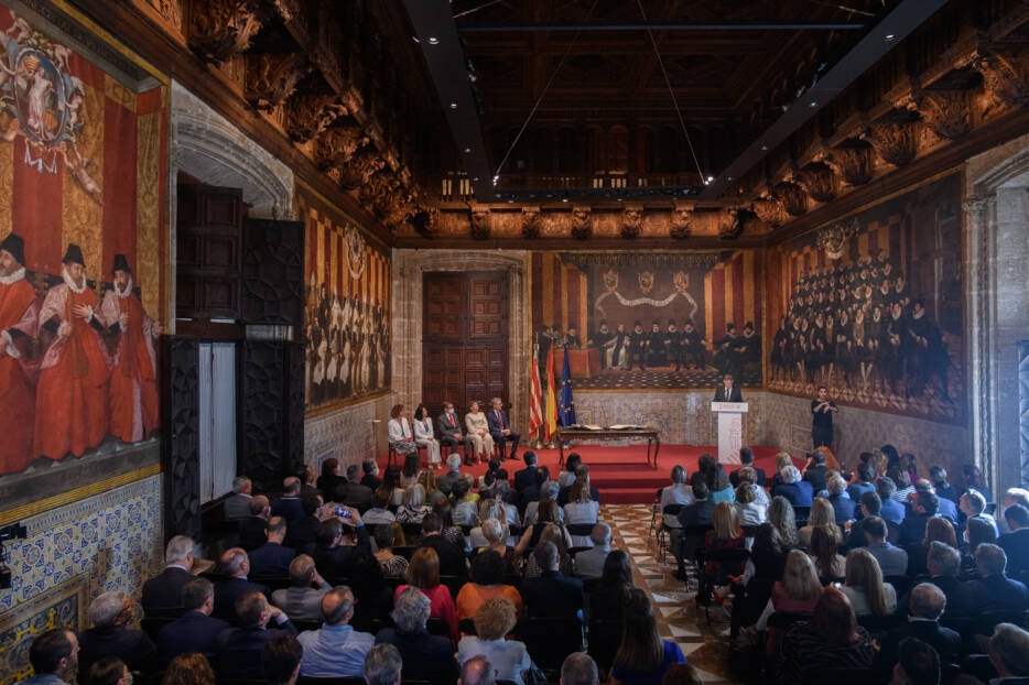 VALÈNCIA (EFE/Loli Benlloch). El nuevo Gobierno valenciano, que por primera vez en la historia del autogobierno tiene más mujeres que hombres, ha tomado este lunes posesión en el Palau de la Generalitat, bajo la mirada desde las pinturas que decoran el Saló de Corts de 102 personas, entre las que solo hay, "bien escondida", una mujer.