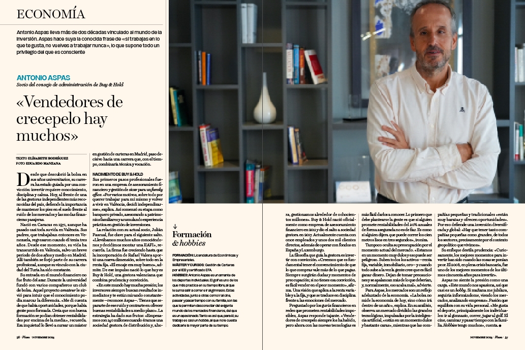 En las páginas de finanzas, Elisabeth Rodríguez entrevista a Antonio Aspas, socio del consejo de administración de Buy & Hold, que lleva más de dos décadas vinculado al mundo de la inversión, un mundo que le atrajo desde el primer momento. Aspas hace suya la conocida frase de «si trabajas en lo que te gusta, no vuelves a trabajar nunca», lo que supone todo un privilegio del que es consciente.