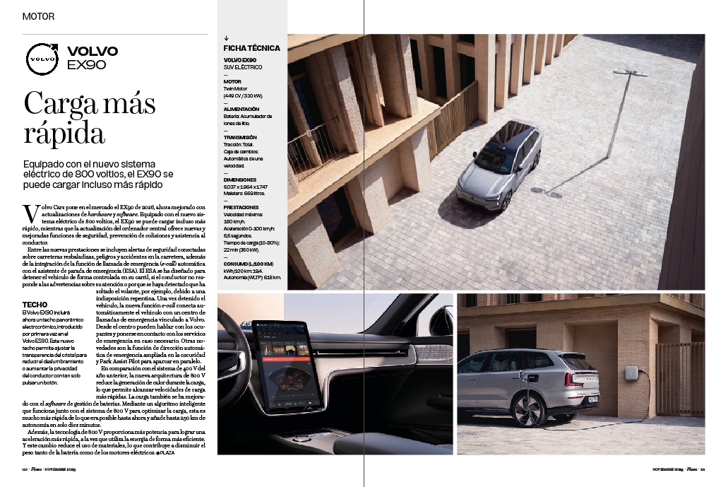 En las páginas de Motor, Vicente Fuster nos cuenta como el nuevo Volvo EX90 cuenta con un sistema eléctrico actualizado, que permite cargar más rápido. Además nos presenta la versión VZ5 del Cupra Formentor, la máxima expresión de la deportividad; nos explica como el IONIQ 9 ha recibido cinco estrellas Euro NCAP, y analiza el El EV5, una pieza estratégica clave en el impulso de Kia para acelerar el acceso a la movilidad eléctrica.